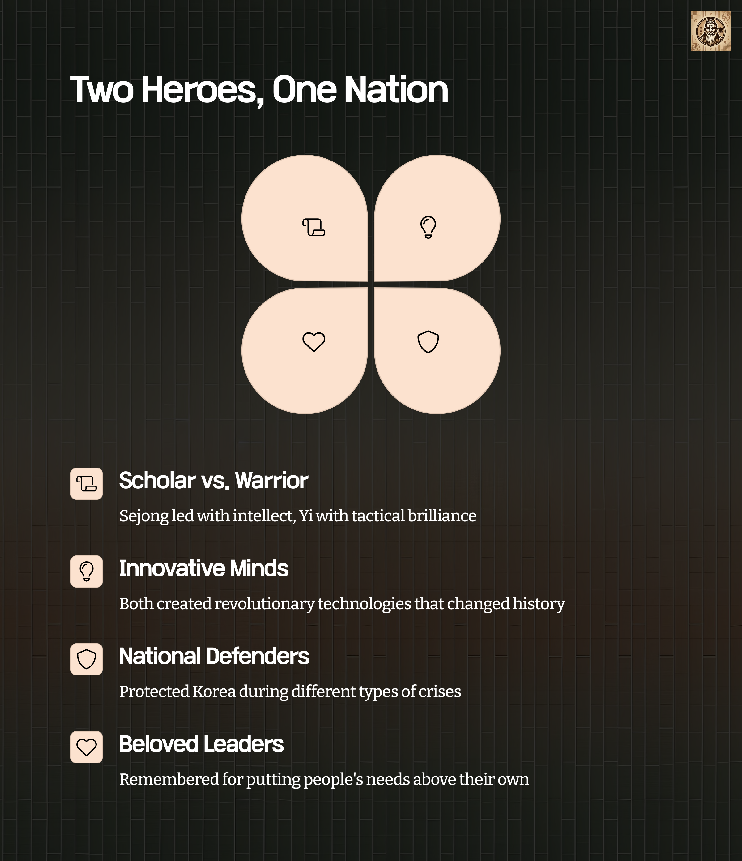 King Sejong improved lives through peace, culture, and education, while Admiral Yi protected the nation during times of war.