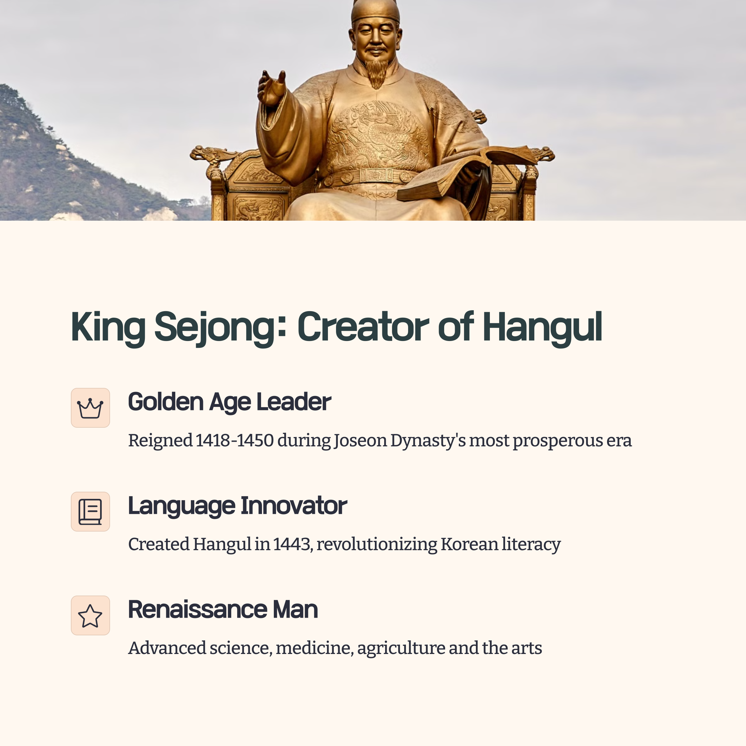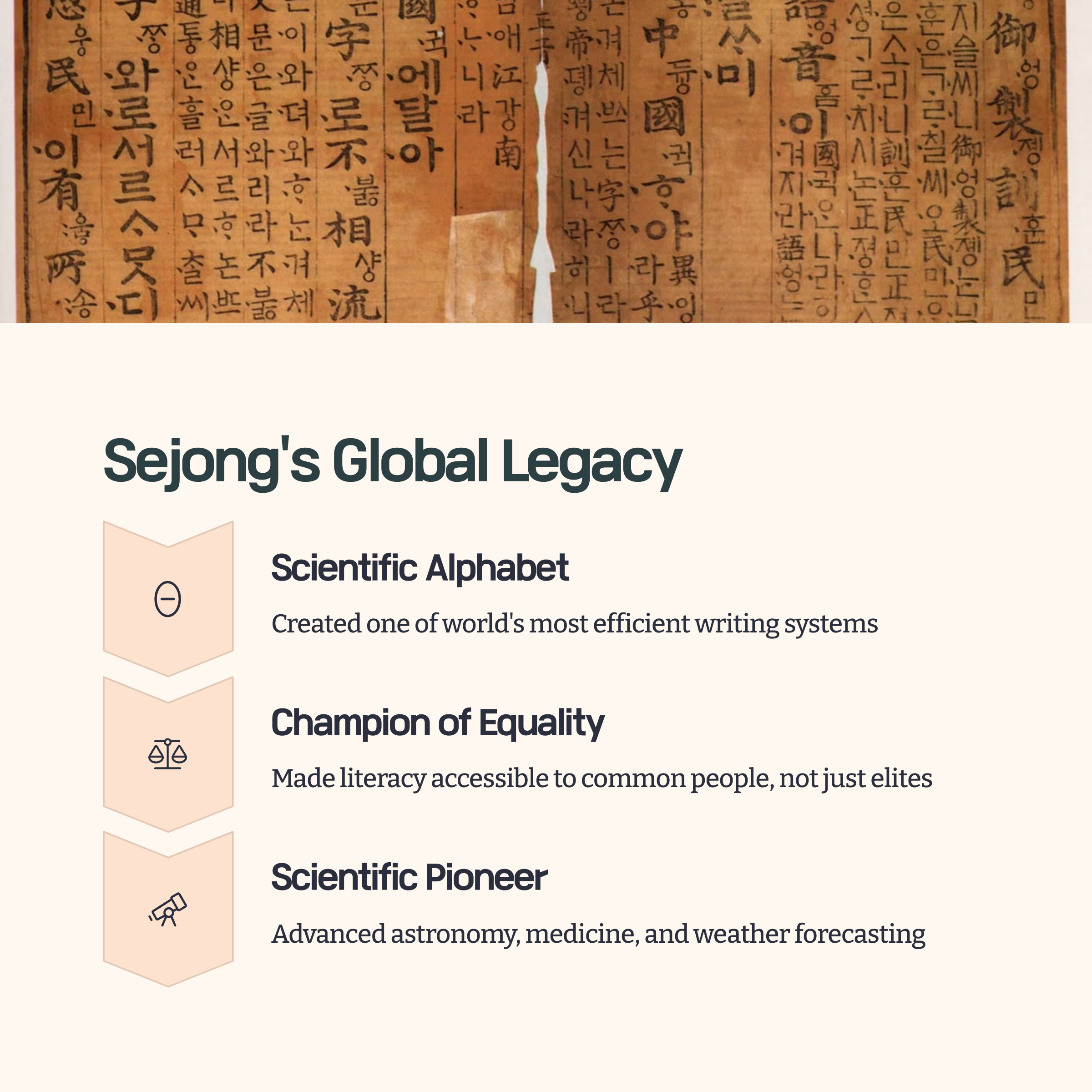 First, King Sejong's contributions go far beyond creating an alphabet.
