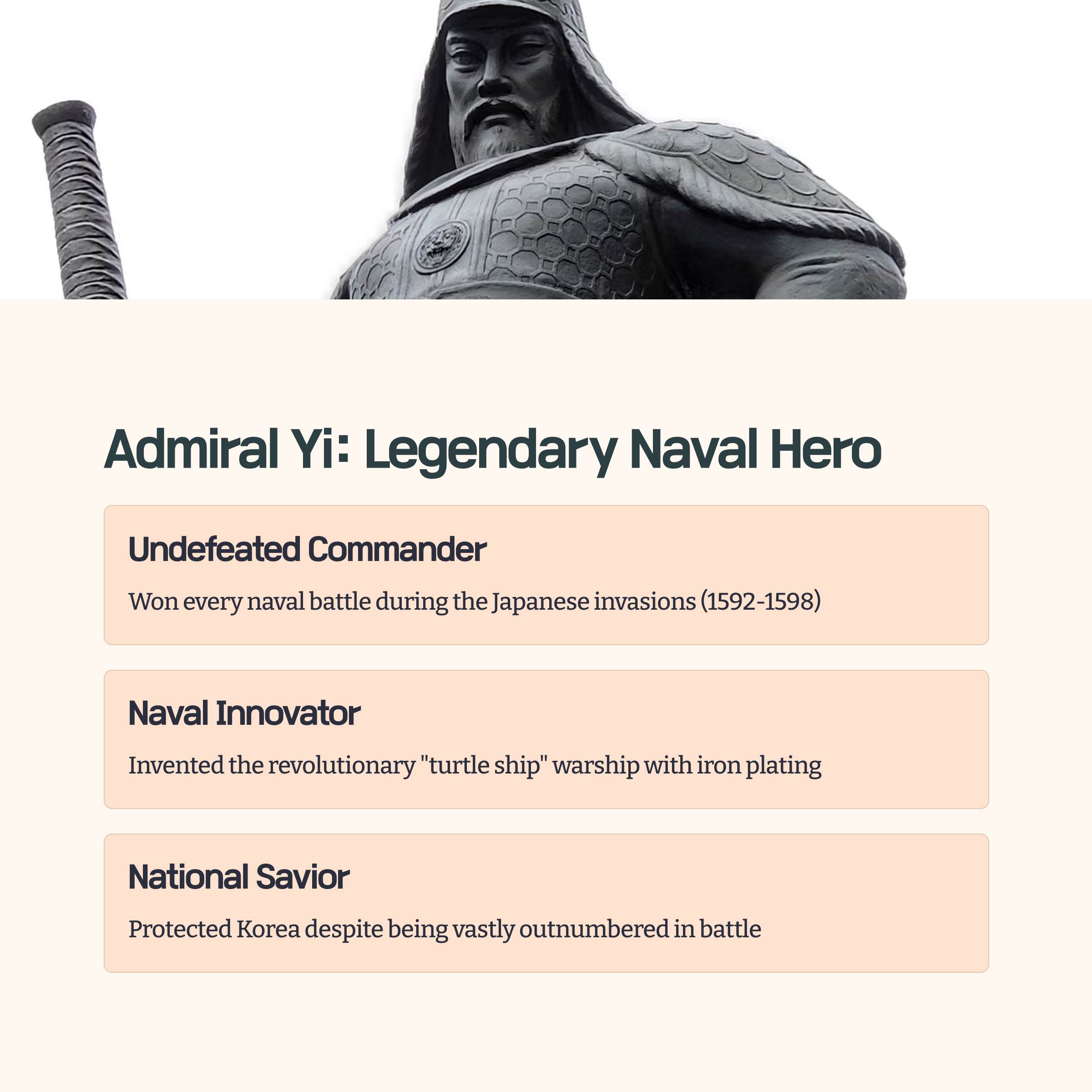 His use of the turtle ship (armored warship) was an unprecedented innovation in naval warfare.