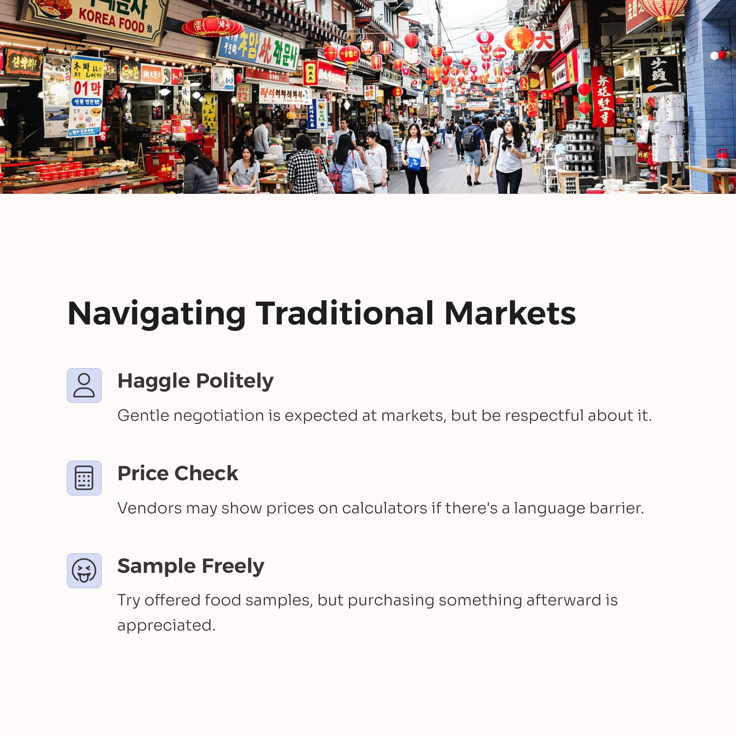 Before traveling, learn basic Korean phrases like "Hello," "Thank you," and "How much is it?"