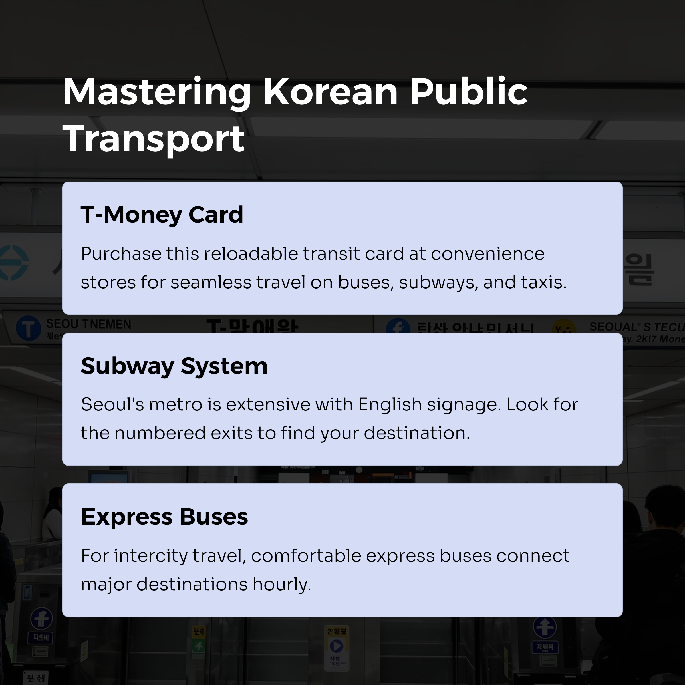 Buying and using a "T-money card" makes traveling much more convenient.